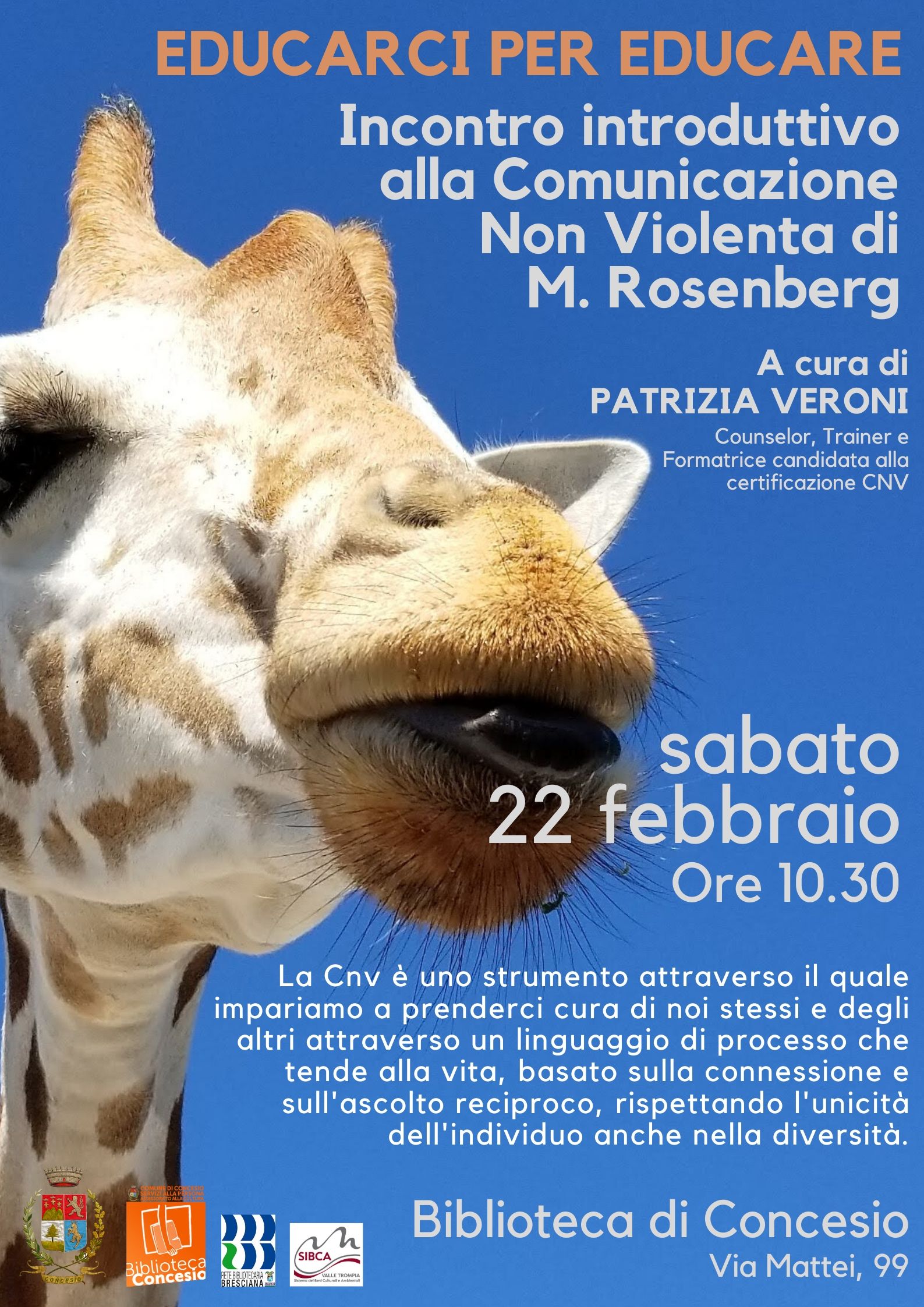 08 Feb EDUCARCI PER EDUCARE Posted at 11:49h in Eventi, Evidenza di biblioconcesio 0 Commenti 0 Likes Share Sabato 22 febbraio alle ore 10.30 Incontro introduttivo alla Comunicazione Non Violenta di M. Rosenberg. A cura di Patrizia Veroni, counselor, trainer e formatrice candidata alla certificazione CNV. Ingresso libero