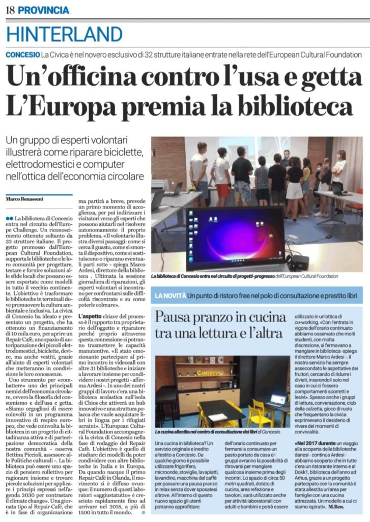 La civica di Concesio ha ideato e presentato un progetto, che ha ottenuto un finanziamento di 10 mila euro, per aprire un Repair Cafè, uno spazio di autoriparazione dei piccoli elettrodomestici, biciclette, device, ma anche vestiti, grazie all’aiuto di esperti volontari che metteranno in condivisione le loro conoscenze. Uno strumento per «combattere» uno dei principali nemici dell’economia circolare, ovvero la filosofia del consumismo e dell’usa e getta. «Siamo orgogliosi di essere coinvolti in un programma innovativo di respiro europeo, che vede coinvolta la biblioteca in un progetto di cittadinanza attiva e di partecipazione democratica della nostra comunità – osserva Bettina Piccioli, assessore alle Politiche culturali -. La biblioteca può essere uno spazio di pensiero collettivo per ragionare insieme e trovare piccole soluzioni per applicare i principi espressi nell’agenda 2030 per contrastare il climate change».