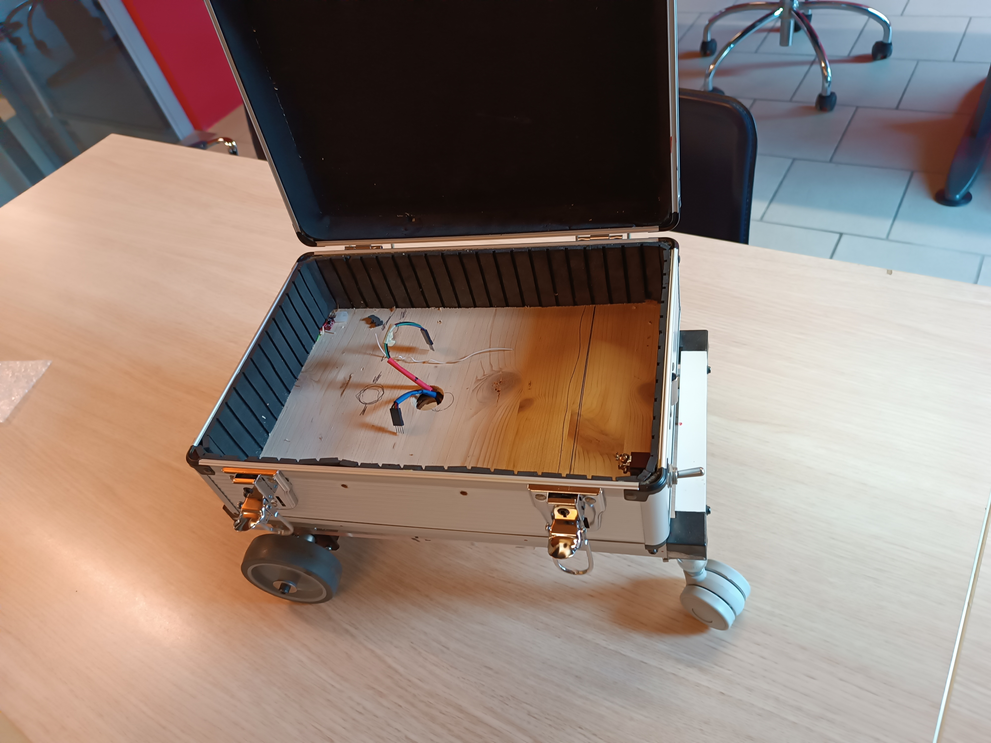 La struttura è già fatta, abbiamo scelto una valigetta porta-attrezzi, svuotata e fissata su un telaio in alluminio a cui sono fissati due motori con rispettive ruote motrici da un lato e due ruote libere dal lato opposto.