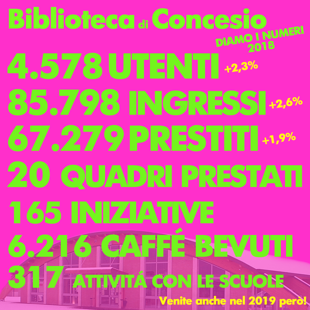 Il 2018 è passato ed è tempo di resoconti e statistiche. Possiamo dire che l'anno appena passato è andato proprio bene. Grazie a tutti voi che avete frequentato la biblioteca, l'avete vissuta e a tutti quelli che hanno dato una mano perché fosse sempre accogliente, vivace, aperta. Ci...