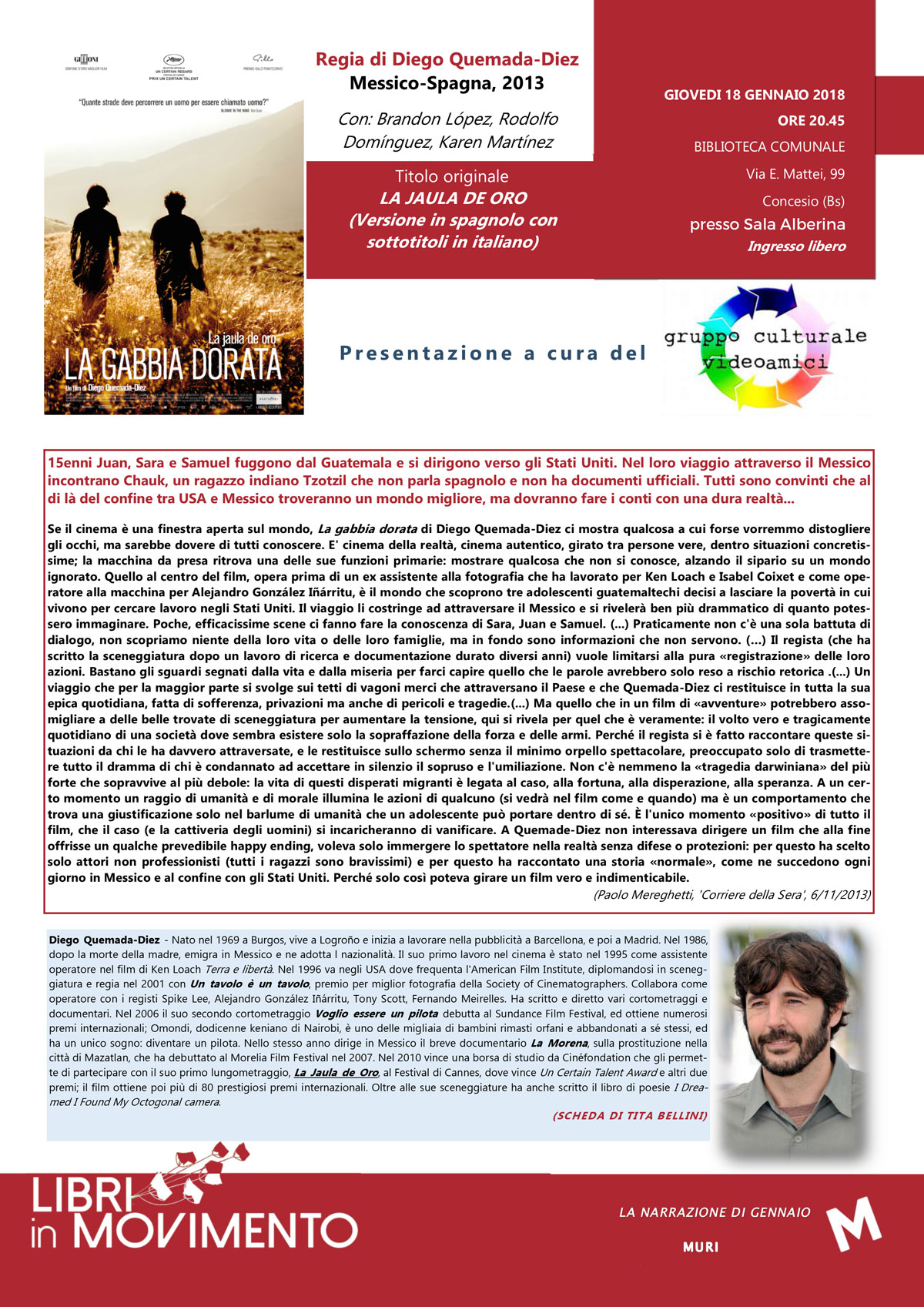 giovedì 18 gennaio ore 20.45 presso la Sala Alberina (a fianco della Biblioteca comunale di Concesio) proiezione del film LA GABBIA DORATA, un film di Diego Quemada-Diez Messico-Spagna, 2013 all'interno della Rassegna LIBRI IN MOVIMENTO 2018 - Tema: MURI a cura del Gruppo Culturale Videoamici del Cinema Sereno (Brescia) Premi e riconoscimenti: ...