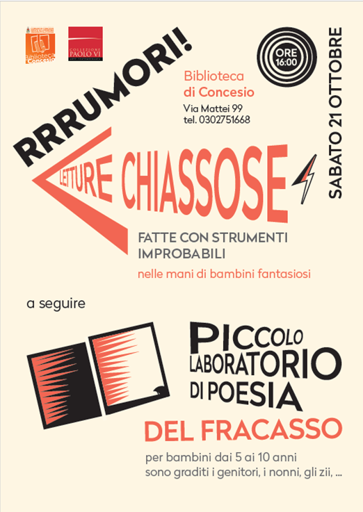 sabato 1° settembre dalle 10.00 alle 24.00 presso la Biblioteca di Concesio SCONFINIAMO: CULTURE IN MOVIMENTO (Teatro, Musica, Confronto, Mostre, Giochi, Sapori) ore 10:00 “CHI HA PAURA DELL’UOMO NERO”: dibattito ore 10:00- ore 15:00 “TIMBUCTÙ” mostra laboratorio per bambini ore 13.00 PRANZO con cibi di Senegal, Burkina Faso, Pakistan, Marocco...
