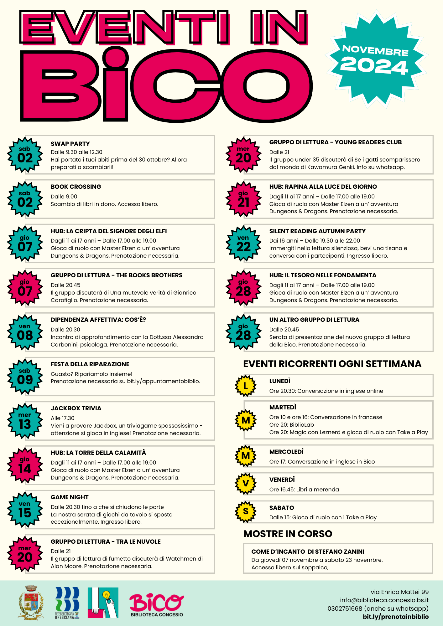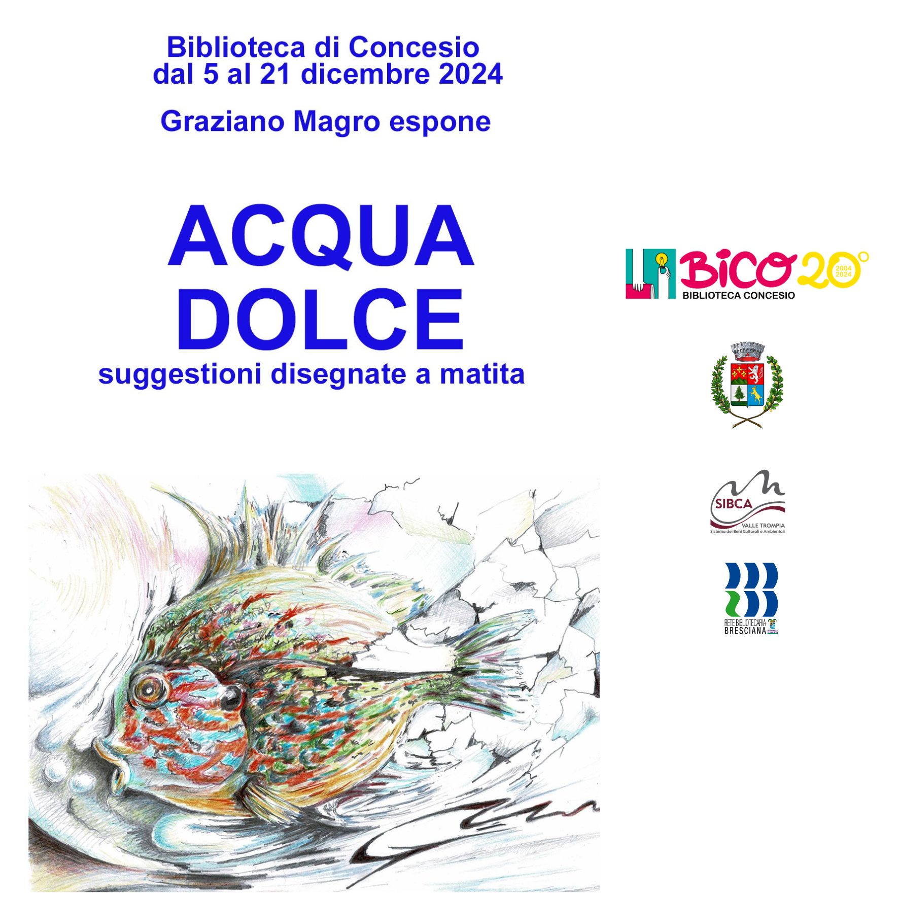 5 - 21 dicembre 2024 GRAZIANO MAGRO presenta alcune "suggestioni a matita": una selezione di quaranta disegni in cui si mescolano spirali e riflessi ispirati al tema del lago. Ingresso libero. La mostra è visitabile negli orari di apertura della Biblioteca. L'artista sarà presente in Biblioteca nel periodo...