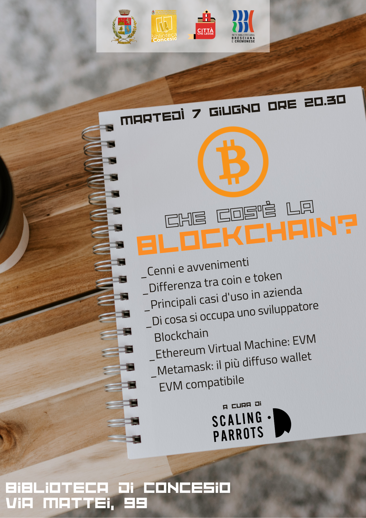 martedì 7 giugno 2022 ore 20:30 _Cenni e avvenimenti _Differenza tra coin e token _Principali casi d'uso in azienda _Di cosa si occupa uno sviluppatore Blockchain _Ethereum Virtual Machine: EVM _Metamask: il più diffuso wallet EVM compatibile a cura di Scaling Parrots presso la Biblioteca di Concesio ...