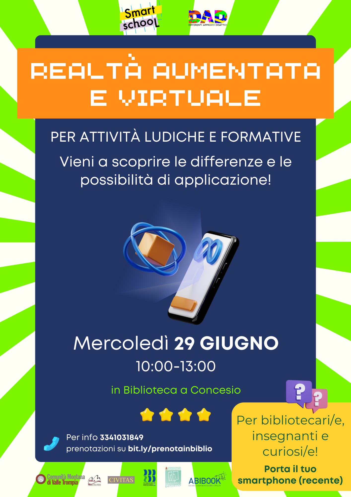 per attività ludiche e formative Realtà aumentata e virtuale per attività ludiche e formative Vieni a scoprire le differenze e le possibilità di applicazione per bibliotecar*, insegnanti, curios* mercoledì 29 giugno ore 10.00 - 13.00 in Biblioteca a Concesio Per iscriverti chiama lo 030 2751668 o prenota su bit.ly/prenotainbiblio Programma della...