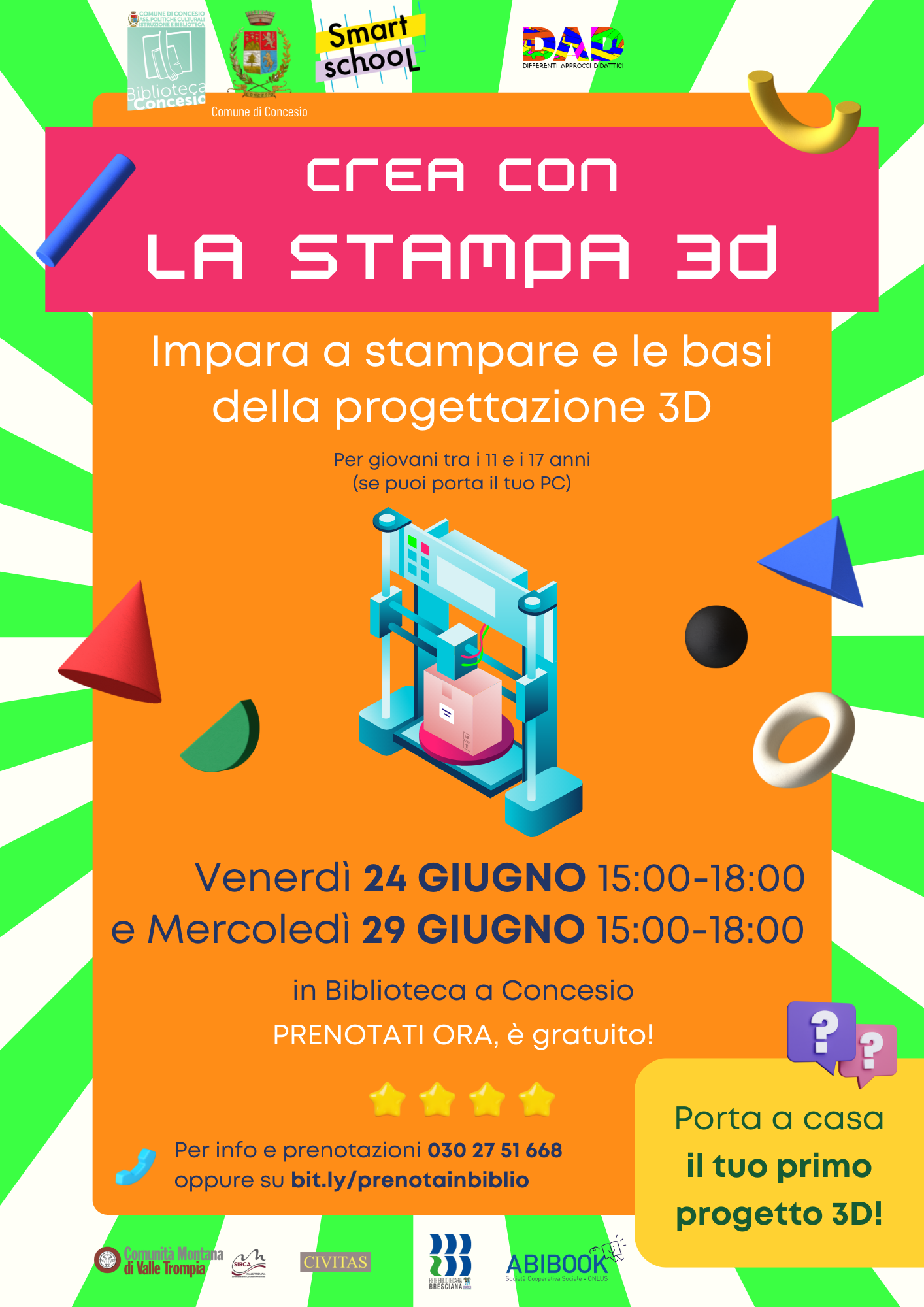 Corso di stampa 3D in 2 incontri Informazioni sull'evento Impara a stampare e le basi della progettazione 3D per giovani dagli 11 ai 19 anni (se puoi porta il tuo PC portatile) venerdì 24 giugno e mercoledì 29 giugno dalle 15.00 alle 18.00 Porta a casa il tuo primo progetto...