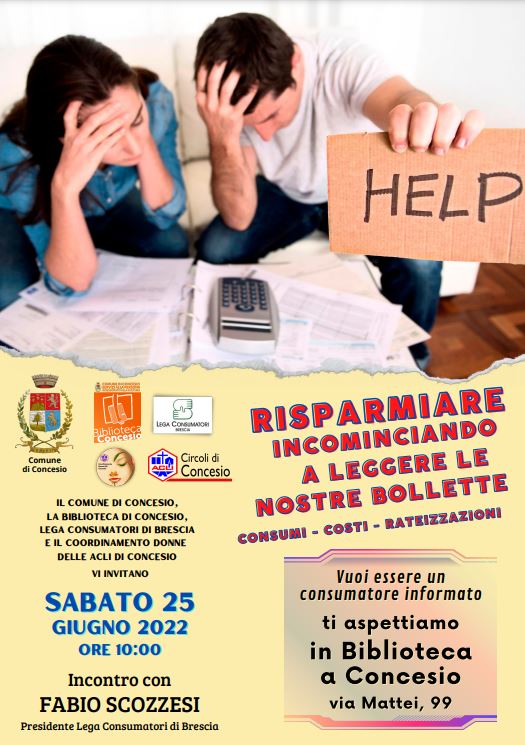 Risparmiare incominciando dalle bollette: consumi, costi, rateizzazioni Vuoi essere un consumatore informato e consapevole? il Comune di Concesio, la Biblioteca, la Lega consumatori di Brescia e il Coordinamento Donne delle Acli di Concesio vi invitanosabato 25 giugno 2022 alle ore 10:00all'incontro con FABIO SCOZZESI - Presidente Lega...