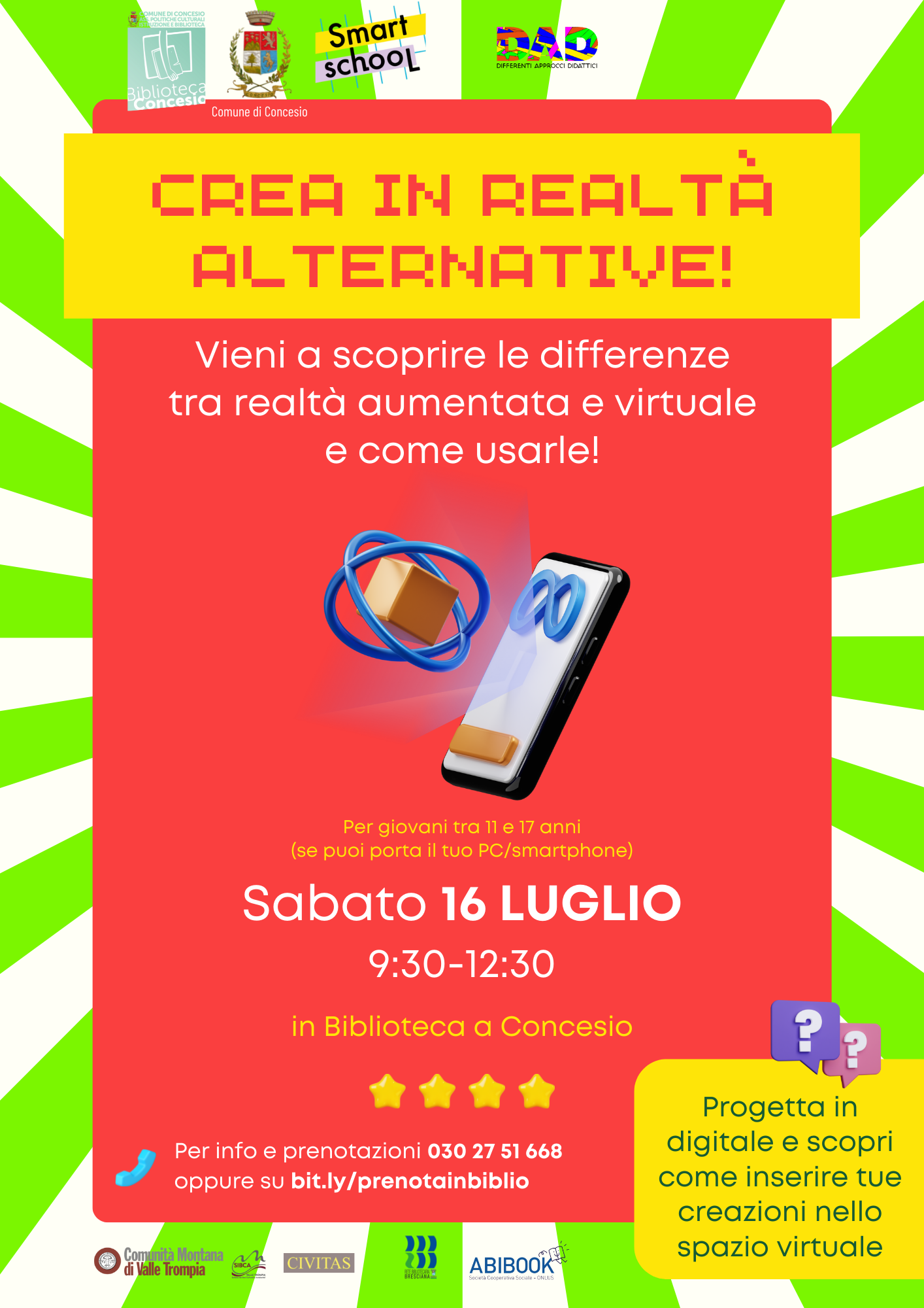 Vieni a scoprire le differenze tra realtà aumentata e virtuale e impara come usarle! Progetta in digitale e scopri come inserire tue creazioni nello spazio virtuale. Informazioni sull'evento Per giovani da 11 a 17 anni (se puoi porta il tuo PC portatile o il tuo smartphone) Sabato 16 LUGLIO...