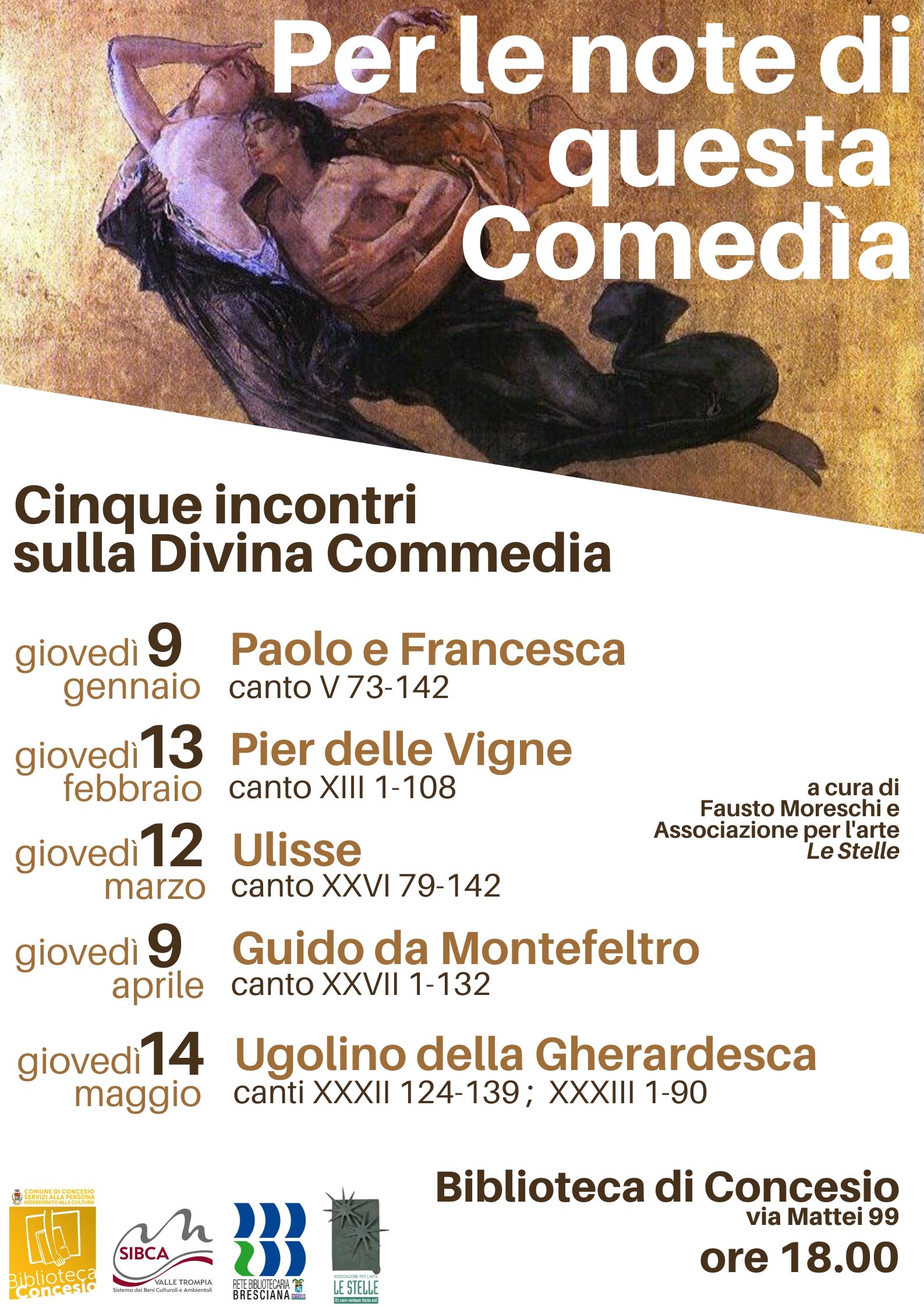 Nuovo ciclo di incontri alla scoperta della Divina Commedia, a cura di Fausto Moreschi e dell'Associazione per l'arte Le Stelle. Alle ore 18.00 nei giovedì: - 9 gennaio "Paolo e Francesca" -13 febbraio "Pier delle Vigne" -12 marzo "Ulisse" -9 aprile "Guido da Montefeltro" -14 maggio "Ugolino della Gherardesca" Ingresso libero ...