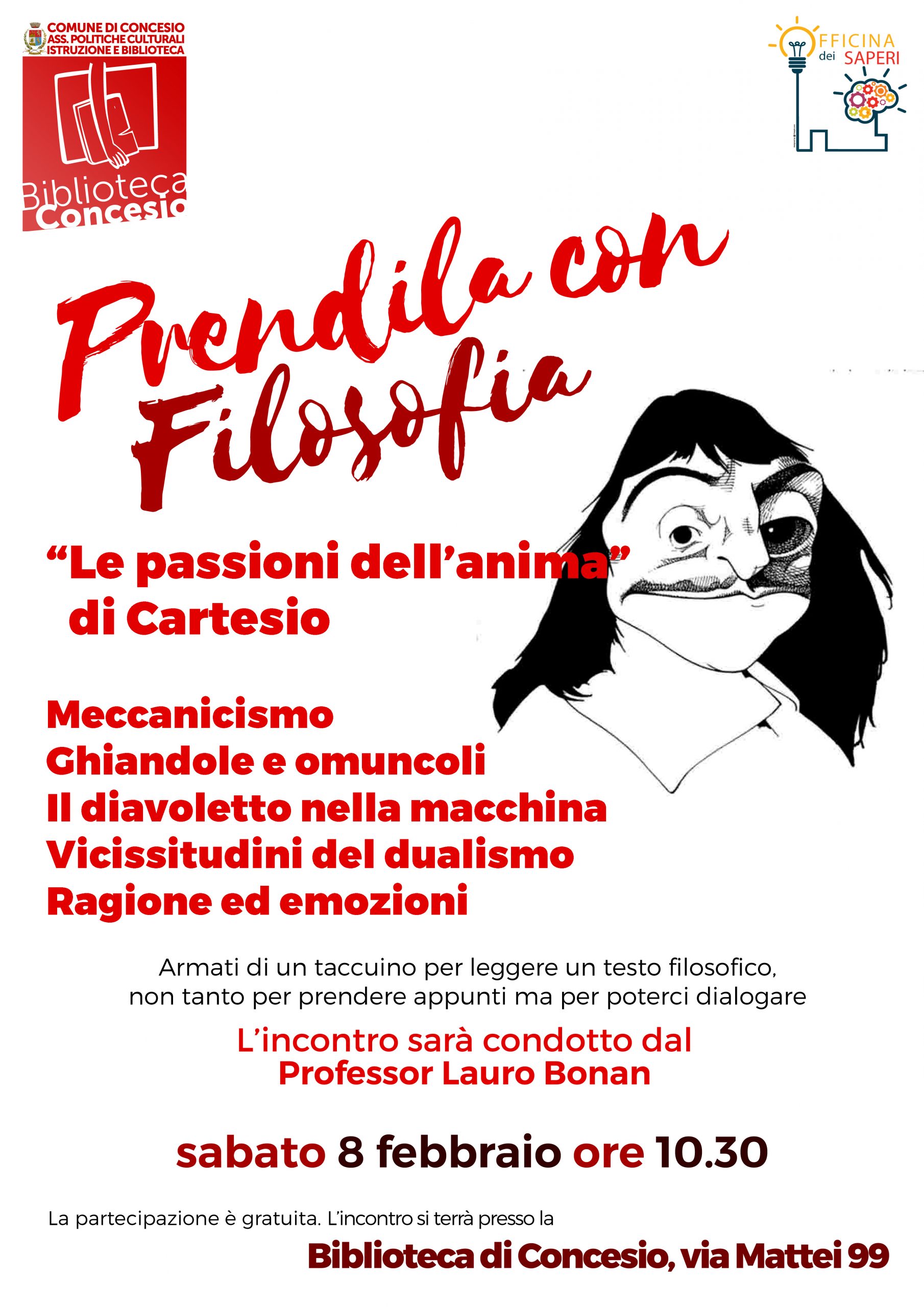 Tornano le chiacchierate filosofiche con il professor Lauro Bonan. Sabato 8 febbraio alle ore 10.30 si parlerà di Cartesio e Le passioni dell'anima meccanicismoghiandole ed omuncoliil diavoletto nella macchinavicissitudini del dualismoragione ed emozioni Armati di un taccuino per leggere un testo filosofico, non tanto per prendere appunti...