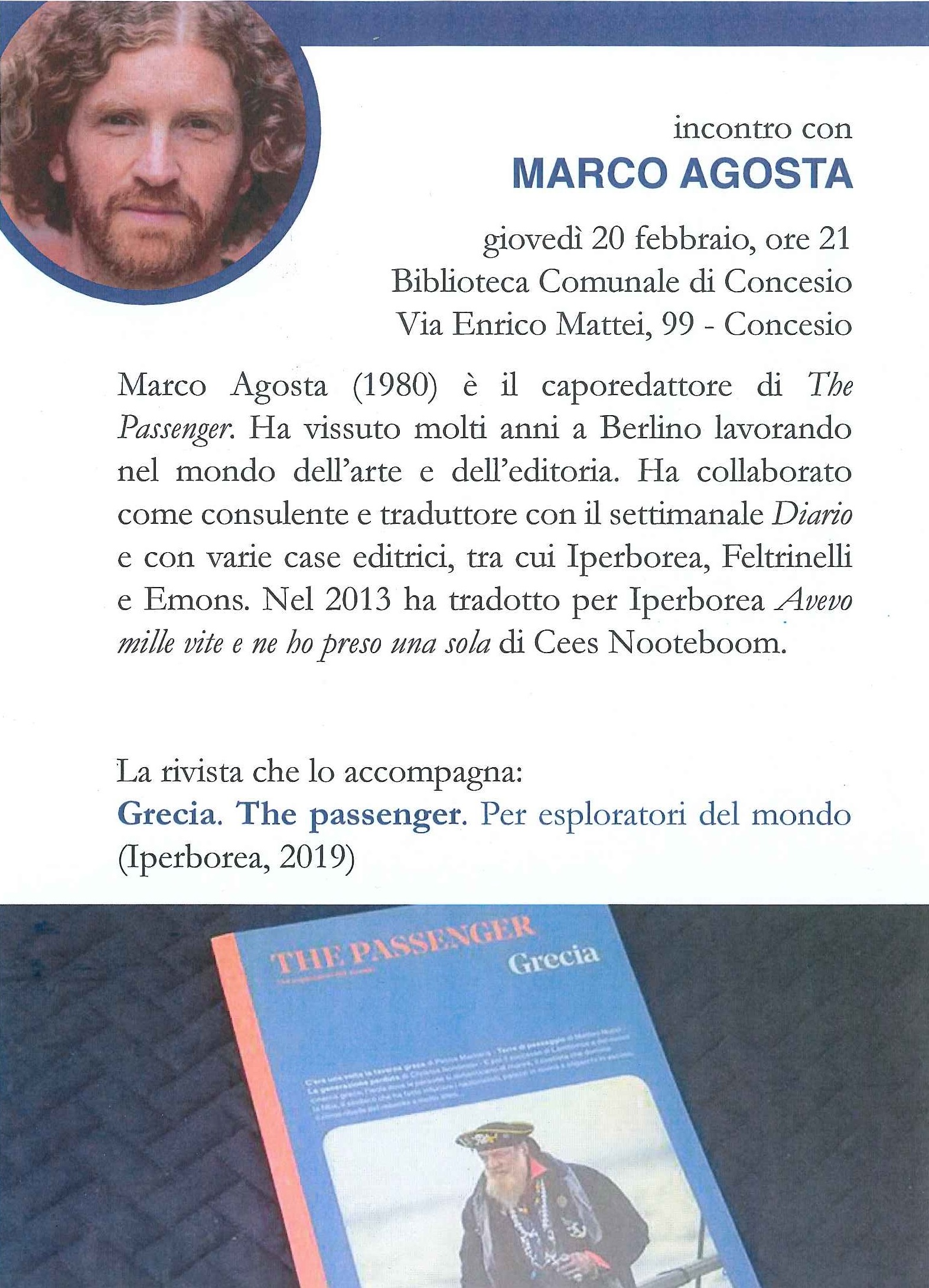 In occasione dei venerdì della narrazione della rassegna letteraria itinerante LIBRI IN MOVIMENTO 2020 Giovedì 20 febbraio ore 21.00 Incontro con il caporedattore di "The Passenger" Marco Agosta. La rivista che lo accompagnerà nella narrazione di febbraio è: "Grecia. The passenger. Per esploratori del mondo". (Iperborea, 2019) Ingresso...