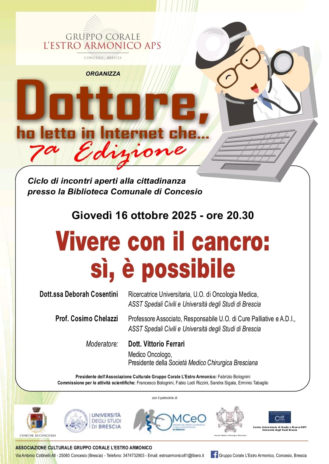 L'associazione culturale "GRUPPO CORALE ESTRO ARMONICO APS" in collaborazione con il Comune di Concesio organizza: Ciclo di incontri aperti alla cittadinanza presso la Biblioteca Comunale di Concesio Terzo appuntamento: Giovedì 16 ottobre 2025 - ore 20.30 "Vivere con il cancro: si, è possibile Relatori: Dott. Deborah Cosentini - ricercatrice Universitaria,...