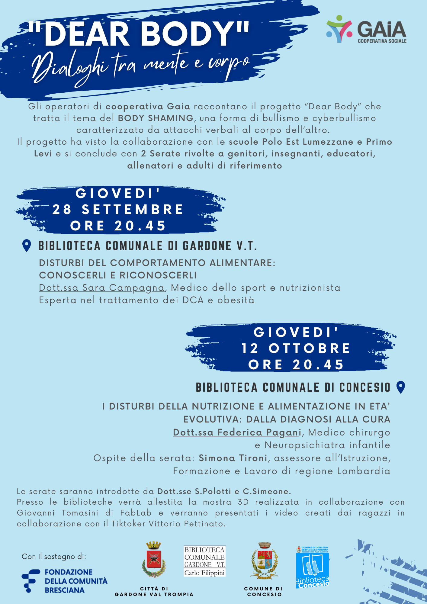 Dialoghi tra mente e corpo giovedì 12 ottobre 2023 ore 20.45 DISTURBI DELLA NUTRIZIONE E ALIMENTAZIONE IN ETA' EVOLUTIVA: DALLA DIAGNOSI ALLA CURAa cura della Dott.ssa Federica Pagani, Medico chirurgo e Neuropsichiatra infantileOspite della serata: Simona Tironi, assessore all’Istruzione, Formazione e Lavoro di regione Lombardia Le serate saranno...