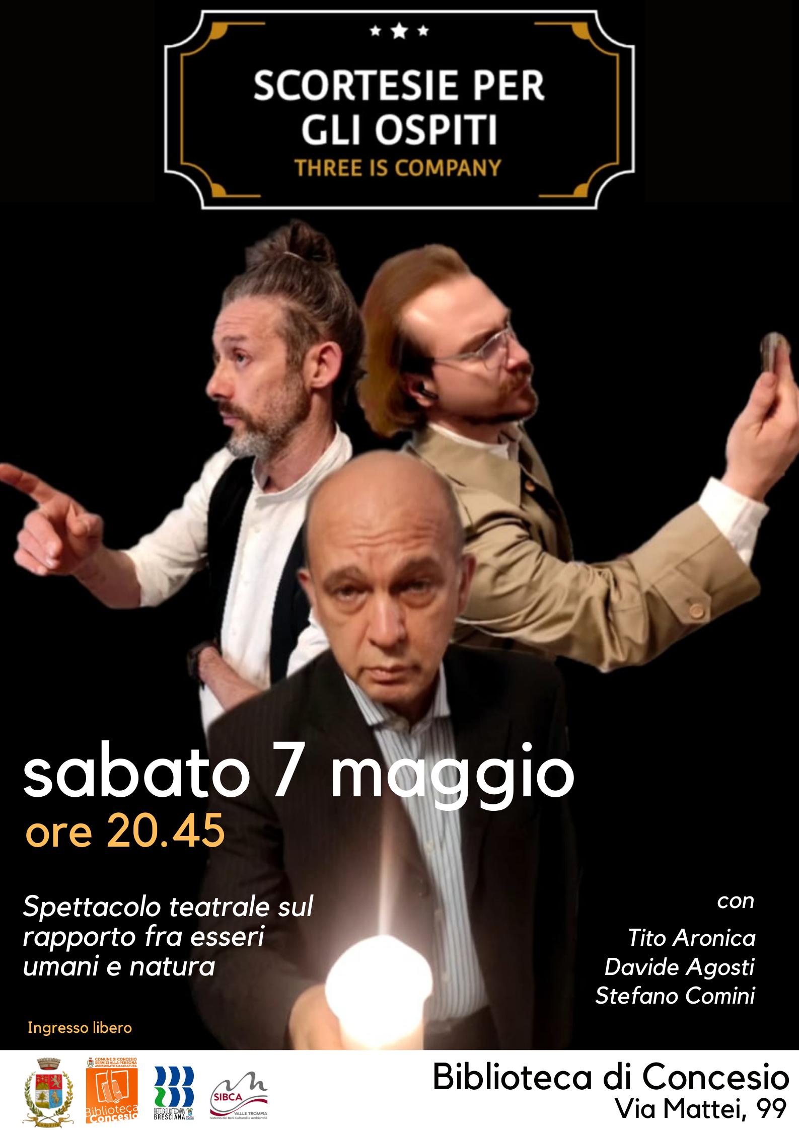 Spettacolo teatrale sul rapporto fra esseri umani e natura della compagnia "Three is company" Sabato 7 maggio ore 20.45 con Tito Aronica, Davide Agosti, Stefano Comini "Scortesie per gli ospiti" è divisa in tre quadri che si alternano: due viandanti bistrattati da un maggiordomo nella villa di una misteriosa signora;...