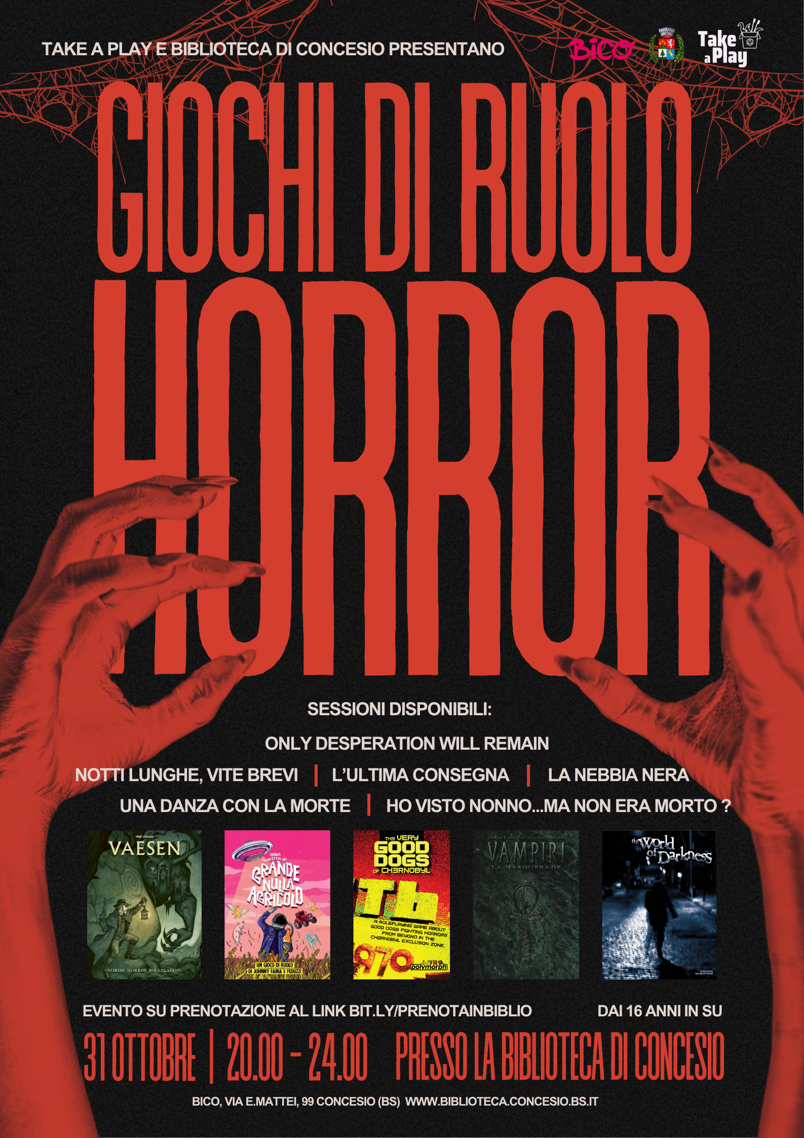 Scarica qui la locandina dell'evento Una serata di giochi di ruolo a tema horror in collaborazione con la community di giocatori Take a play. Ci sarà la possibilità di partecipare a sei sessioni di gioco diverse, le sessioni devono essere prenotate sul sito: bit.ly/prenotainbiblio e sono aperte...