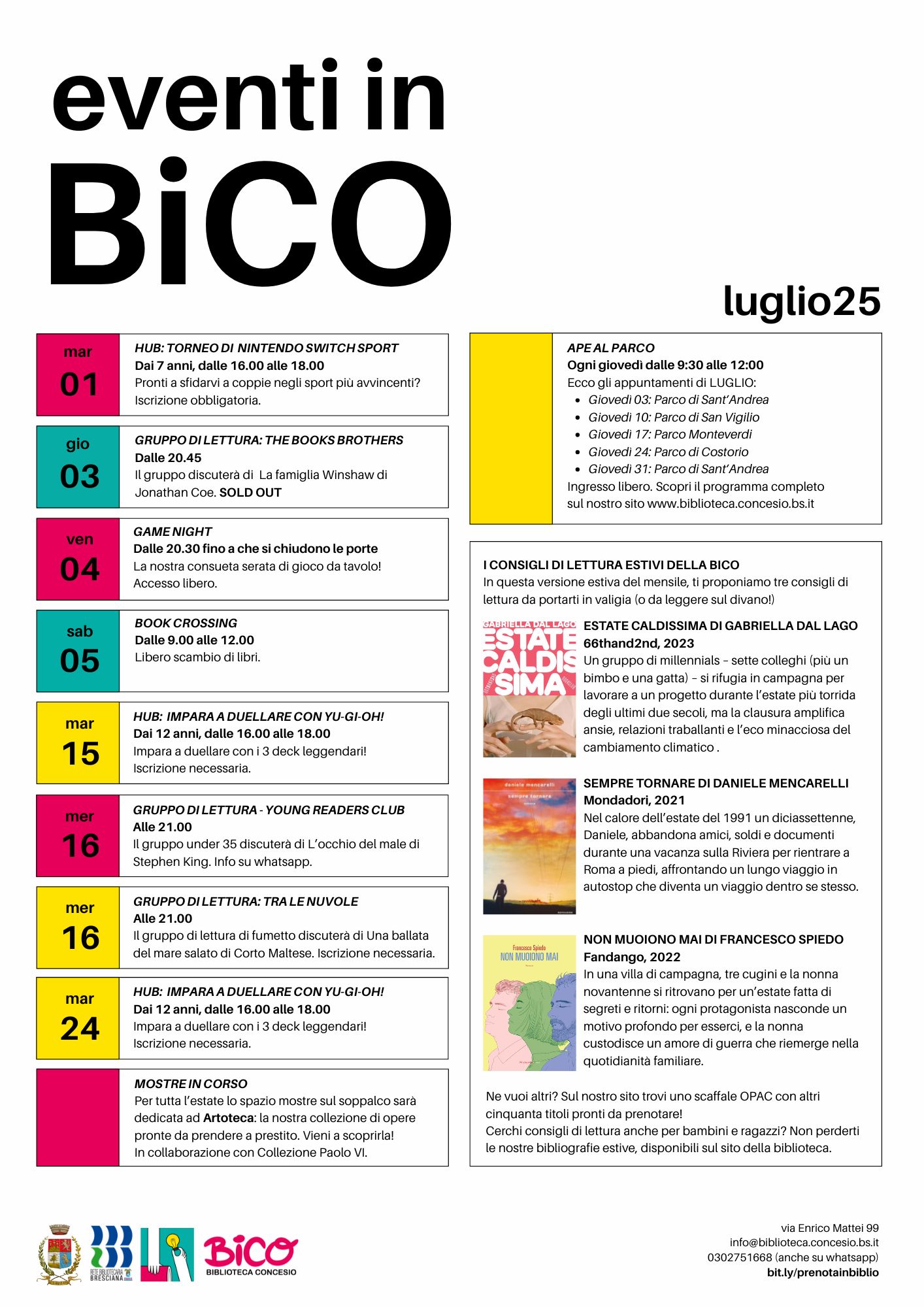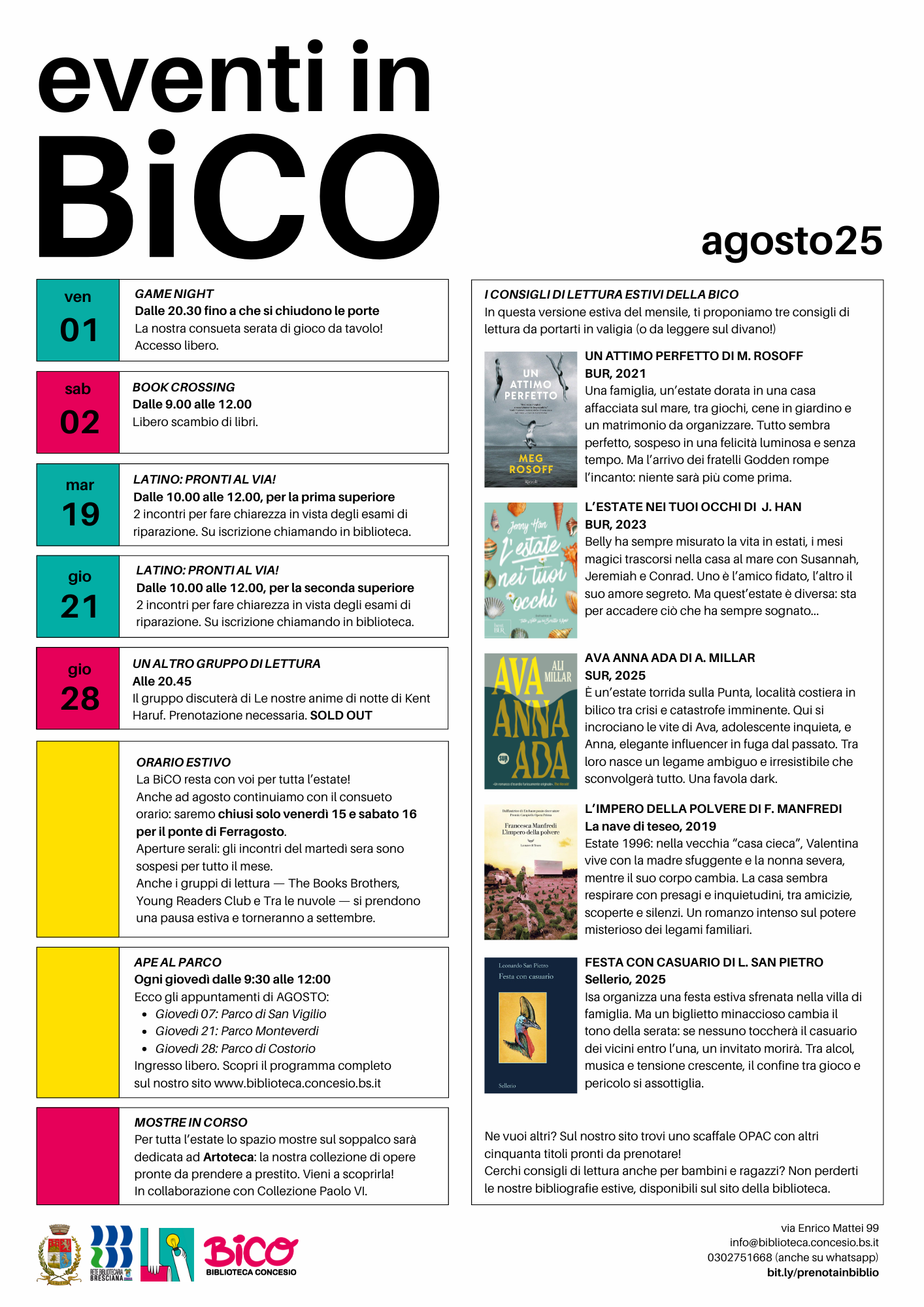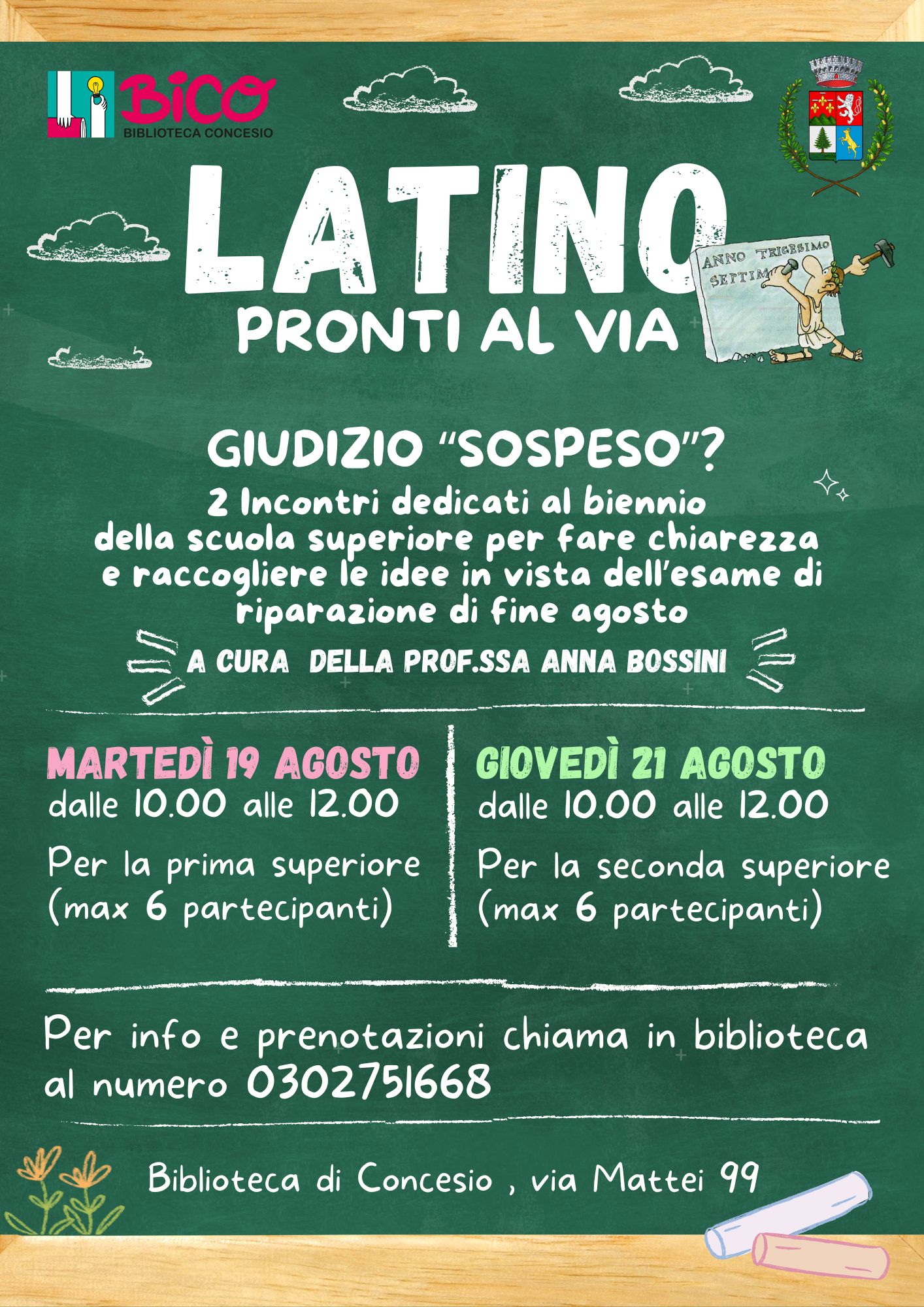 Giudizio scolastico sospeso in latino? La biblioteca organizza 2 Incontri dedicati al biennio della scuola superiore per fare chiarezza e raccogliere le idee in vista dell’esame di riparazione di fine agosto. A cura della Prof.ssa ANNA BOSSINI MARTEDÌ 19 AGOSTO dalle 10.00 alle 12.00 per chi ha frequentato...