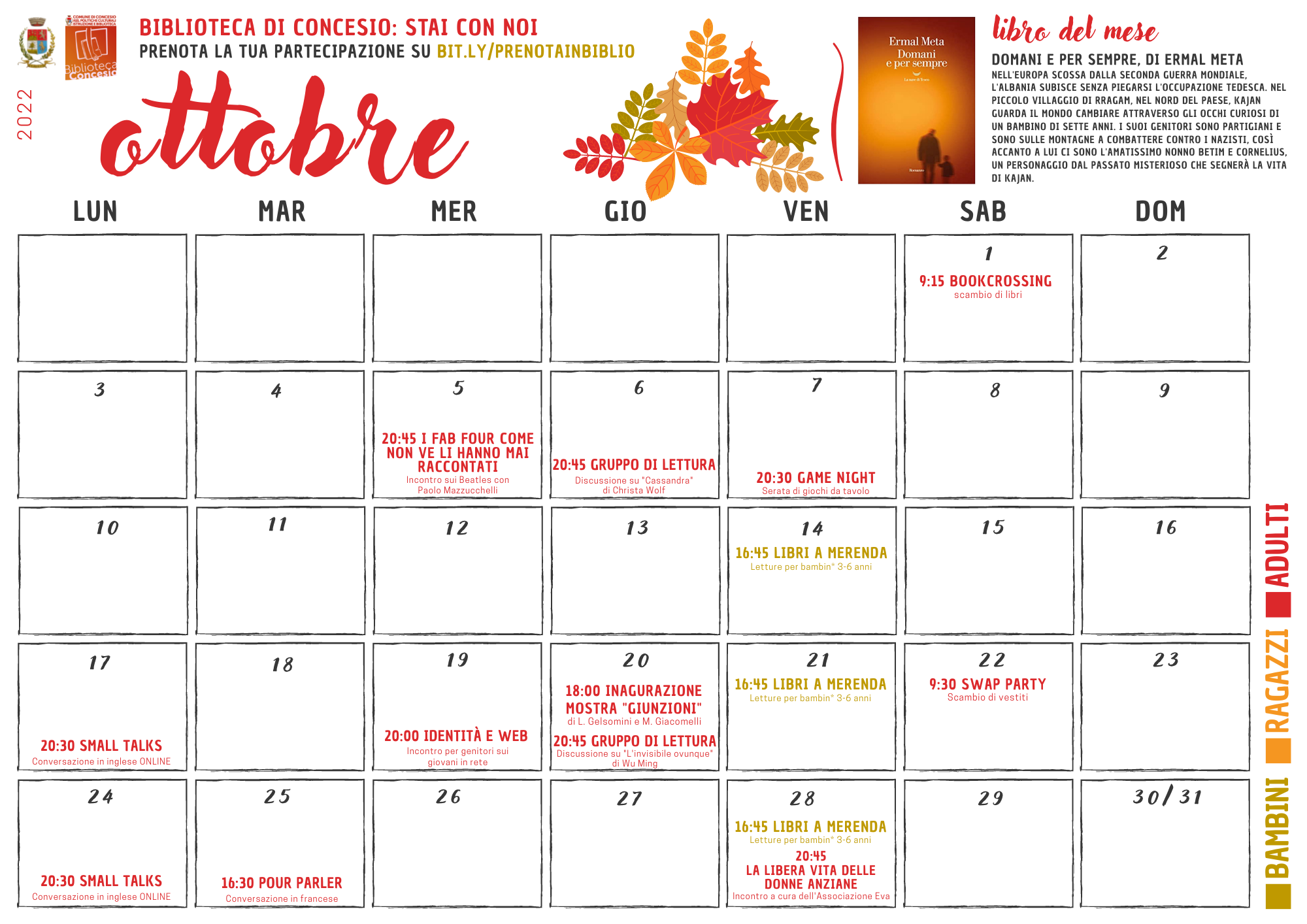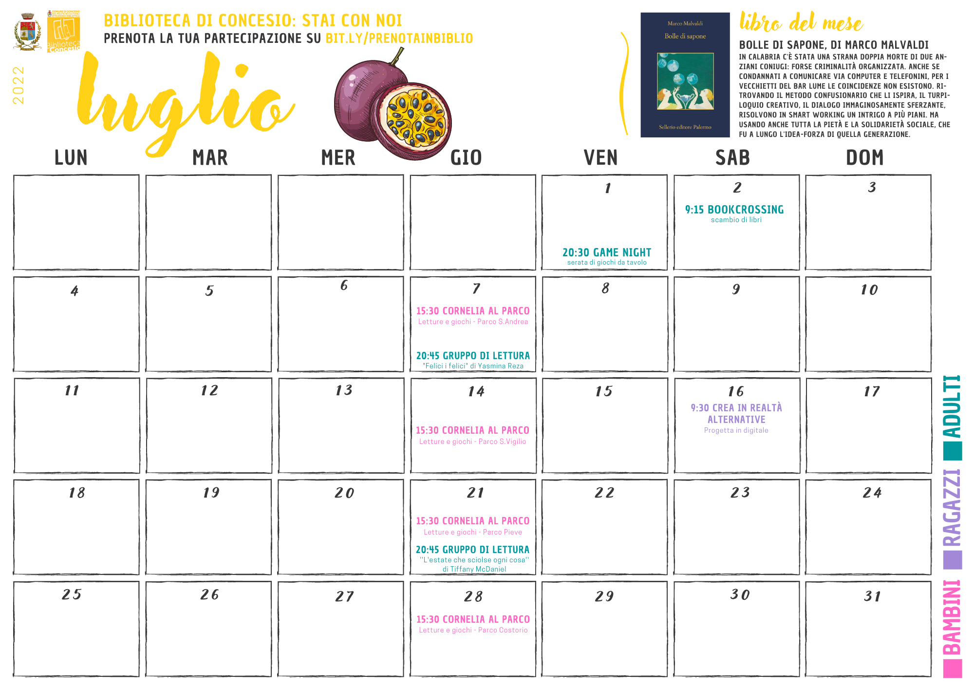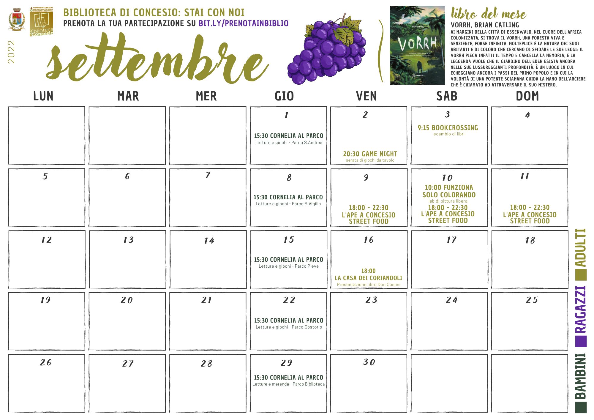 Abbiamo preparato un calendario per avere sott'occhio tutti gli appuntamenti. Clicca e scarica qui! Agosto è sinonimo di ferie, vacanze e viaggi, ma la biblioteca resta aperta con il consueto orario! Eventi Appuntamento speciale sabato 27 agosto alle 10:00 con le famiglie dei nuovi nati di Concesio....