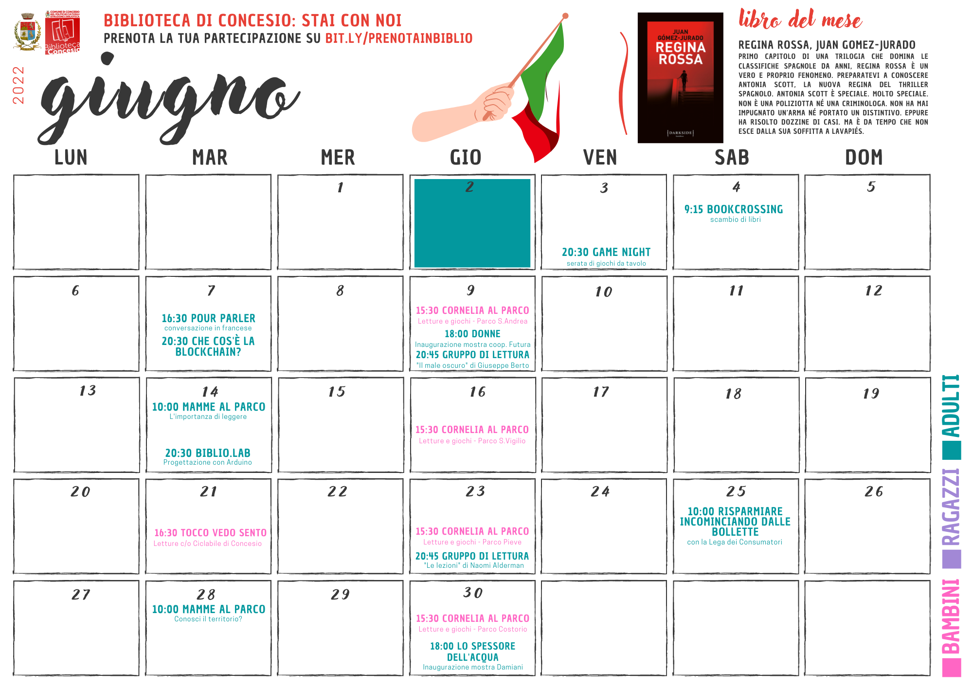 Abbiamo preparato un calendario per avere sott'occhio tutti gli appuntamenti! Clicca e scarica qui Arriva l'estate, finisce la scuola e da giugno cambia anche la programmazione della biblioteca! Si concludono tutti i corsi (Pour parler il 7 giugno e Small Talks il 9 giugno, Biblio.lab il...