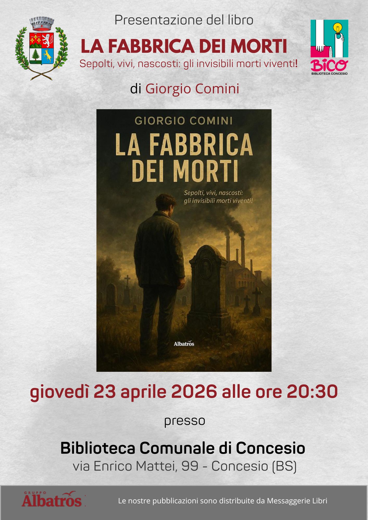 Incontro con l’Autore: Giorgio Comini presenta La fabbrica dei morti Scarica qui la locadina dell'evento Un appuntamento speciale attende la comunità di Concesio. Giovedì 23 aprile, alle ore 20.45, la nostra biblioteca avrà il piacere di ospitare Don Giorgio Comini per la presentazione del suo nuovo romanzo:...